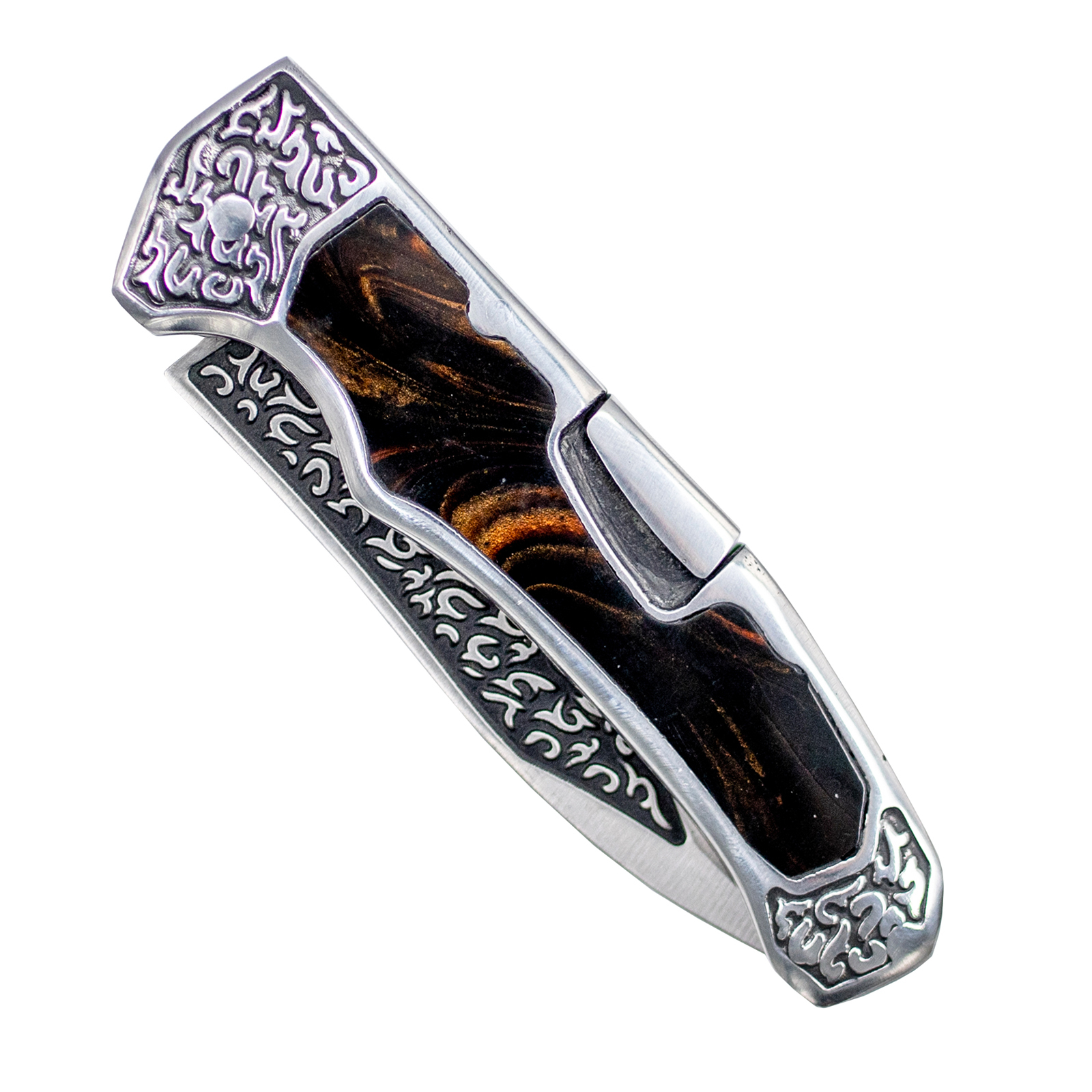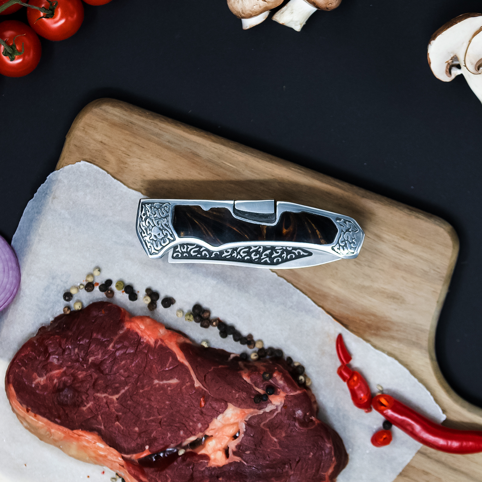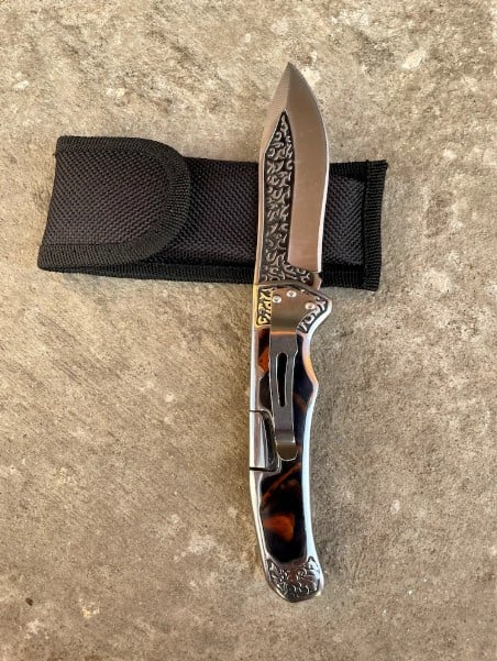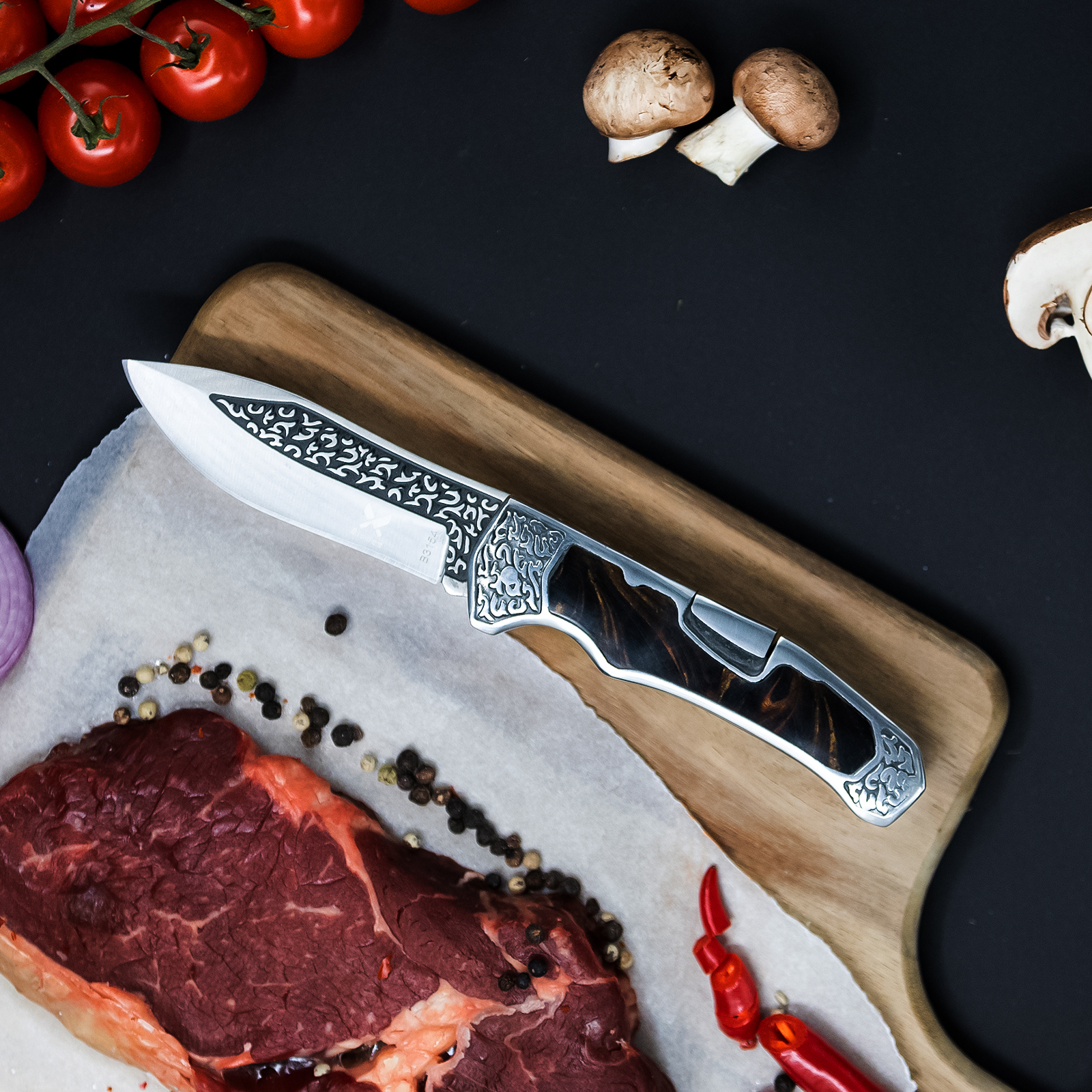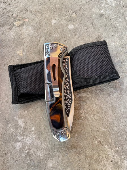 Колекционерски нож, който всеки любител или любител на ножовете или готвенето ще оцени. Лек, малък и преносим, само 21 см, който лесно можете да закачите на колана си, защото се предлага в предпазна текстилна обвивка. Заслужава си парите и съм доволен от покупката!