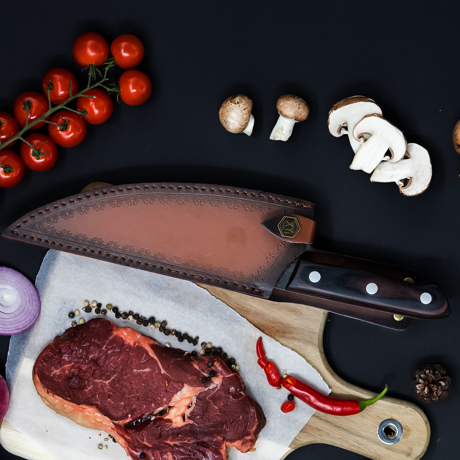 нож Razor II, кухня и къмпинг, ръчно кован, въглеродна стомана, цял ръб 32,5 см, черна дървена дръжка, покритие от екологична кожа